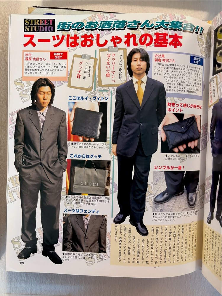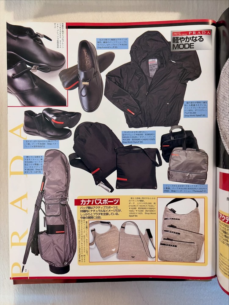 프라다 스포츠라인과 미우미우 남성 컬렉션을 소개하며 롤렉스, 오메가 등 당시 일본에서 가장 인기 있던 시계 브랜드들 부터, 일과 여가에서 모두 착용 가능한 캐주얼 의류들,