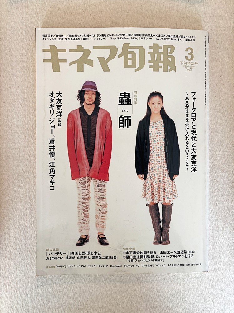 キネマ旬 (키네마 준보) magazine은 1919년 창간한 일본의 대표적인 영화잡지입니다. 2007년 3월호에서는 만화 충사를 원작으로한 무시시의 두 주인공 오다기리 죠와 아오이 유우가 커버를 장식합니다. 무시시는 아키라의 감독인 오토모 카츠히로의 첫번째 실사 영화로도 유명하죠.