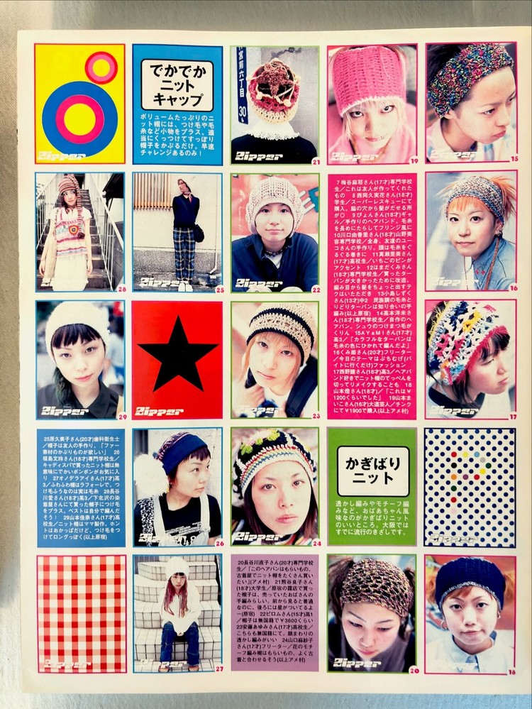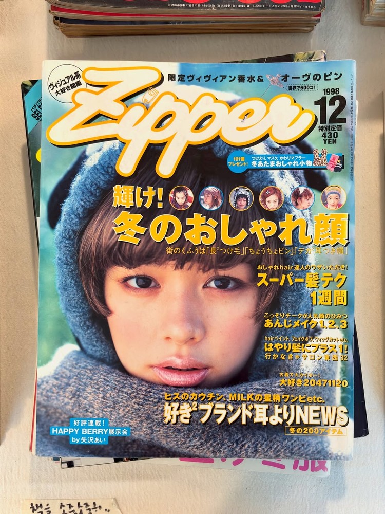 Zipper 1998년 12월호는 “겨울철 스타일리시한 얼굴 연출하기” 라는 특집으로 헤어스타일은 물론 귀마개, 머플러, 모자 등 겨울철 아이템을 활용한 코디를 중점으로 다루었습니다. 또, 당대 인기 브랜드였던 MILK, X-girl, Hysteric Glamour 같은 하라주쿠 걸리시, 스트리트 브랜드들의 최신 아이템 뉴스와 겨울 소품 카탈로그까지 담았죠.