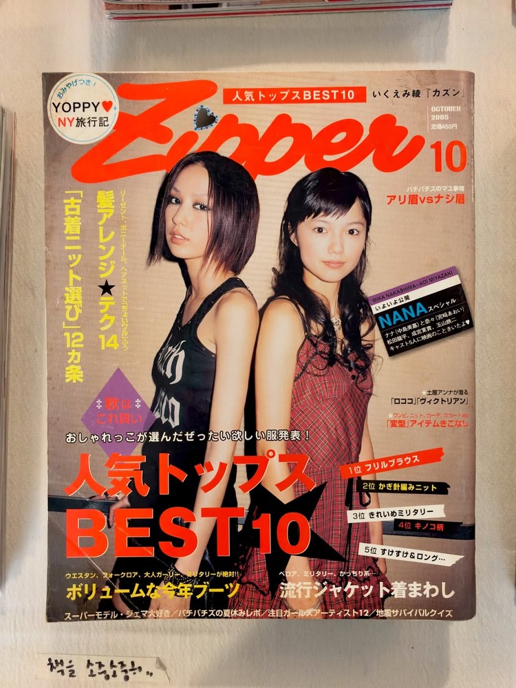 Zipper 2005년 10월호는 NANA 영화 개봉을 기념해 두 주인공 미야자키 아오이와 나카시마 미카가 커버를 장식합니다. YOPPY의 뉴욕 여행기와 NANA 주연들의 인터뷰가 특집으로 실렸습니다.