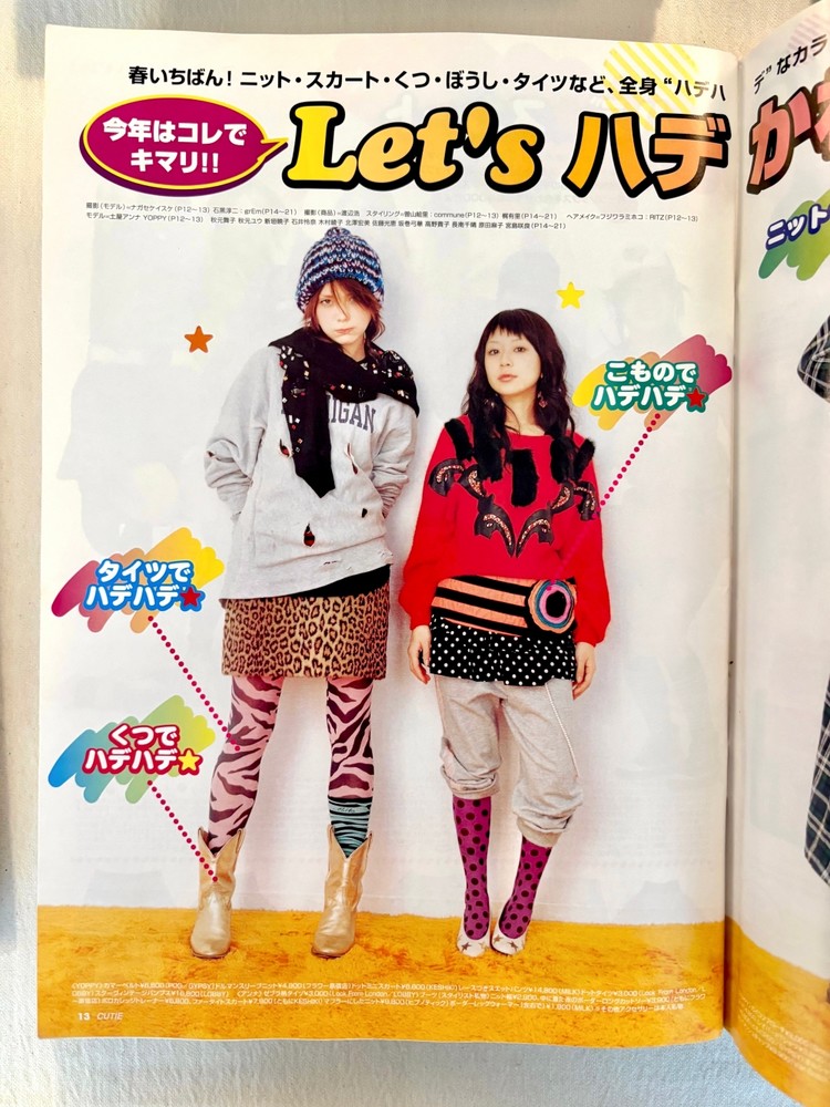 CUTiE 매거진 2004년 2월호는 Let’s 하데카와 코디! 라는 주제로 다가올 봄 시즌 트렌드를 제안하고 있습니다. 하데카와(派手かわ) 란, 하데 (派手): 화려하다 와 카와이(可愛い) : 귀엽다 의 합성어로 선명하고 눈에 띄는 색채나 디자인, 독특한 아이템 등으로 “화려하지만 귀엽다!” 라고 느끼게 하는 패션 스타일이나 테이스트를 가리키는 신조어(당시)에요.