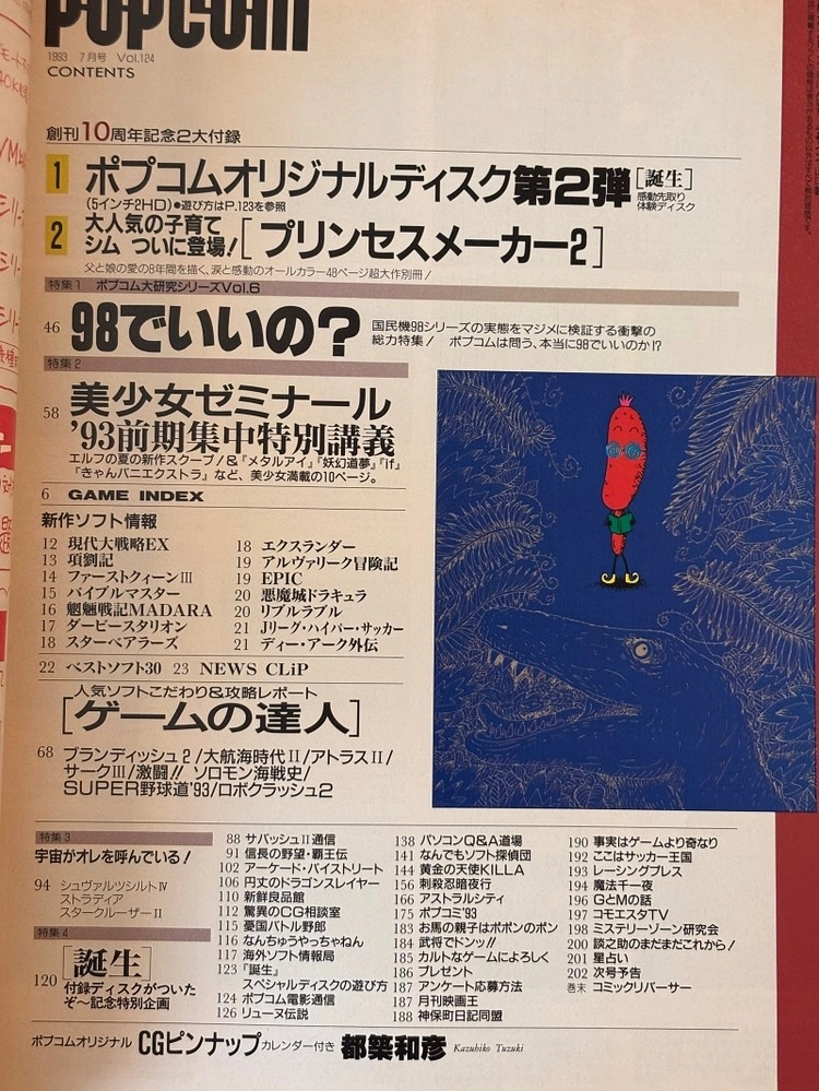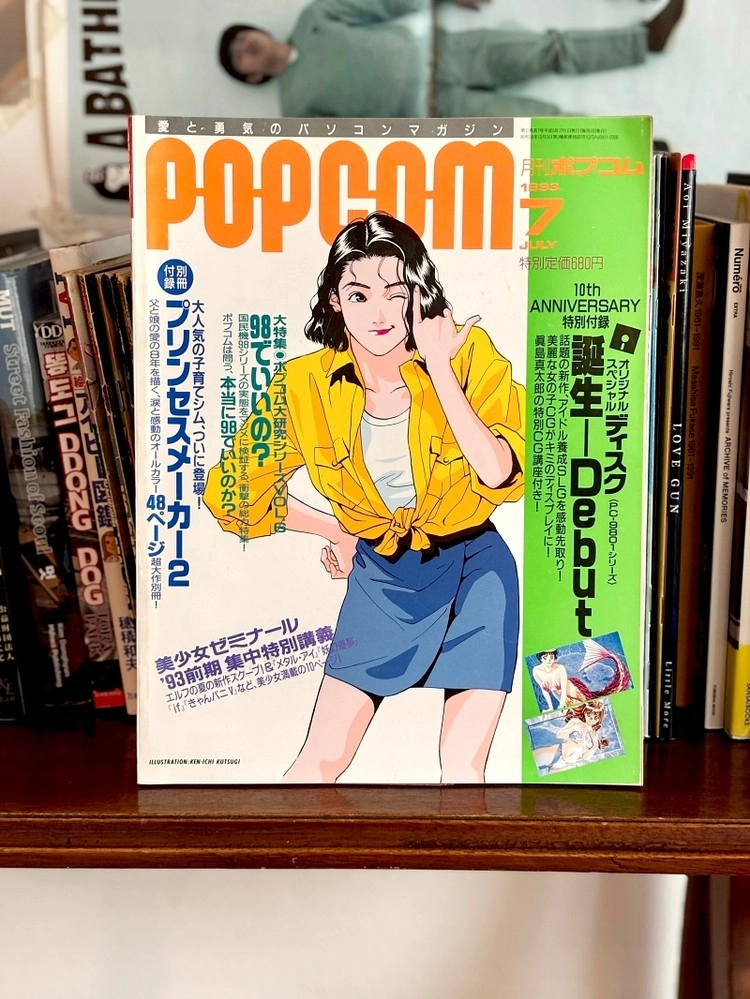 90년대 초반 출간된 popcom 을 확인하세요. 당시 일본 PC 게임 황금기 발행된 PC 잡지로 다른 하드코어 게임 잡지들과 달리 패셔너블한 일러스트와 세련된 편집 디자인을 지향한 잡지입니다.